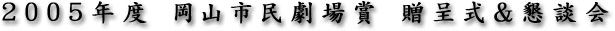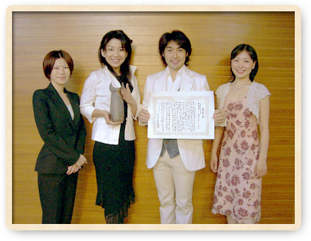 去る5月6日(土)、岡山国際交流センターにて、『2005年度岡山市民劇場賞の贈賞式&懇談会』が開かれ、吉田、中村、相原、松井が出席しました。 私たちは2005年11月に「FAME」を、岡山市民劇場50周年記念例会のひとつとして上演させていただきました。 その時の舞台創りにかける思い、姿勢が評価され、「劇団スイセイ・ミュージカル」に「新鋭賞」という栄誉ある賞をいただきました。 贈賞式では、各団体オリジナルのこころのこもった賞状と、記念品として備前焼の花器をいただきました。
