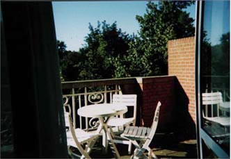 こ〜んなテラスがついていたのだ(^^)。 天気のいい日はこのテーブルに食事を持ち出して、 テラスで食べていた。 ちなみに、この写真ではよく判らないが、 奥の方に見える樹木の何本かは、後述する ファンデル公園のものである。
