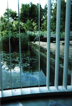 冗談のようだが、マジ(笑)。合成ナシ。 手前はオフィスのブラインドと、 物を置けるようにちょっと広く取ってある窓枠。 身長のある人なら、窓を開けて手を伸ばせば 水面に触れられると思う(^^;)。 向こうに見える鳥は、ああ見えて結構でっかくて、 羽を広げれば1mくらいは軽くあるのだ。 時々飛んできてはひなたぼっこしていた。