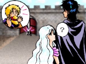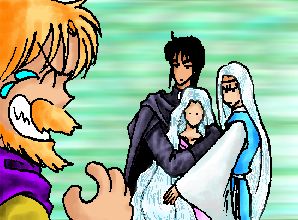 エルウィングの父と息子が同時に叫び、見事なタイミングで両側からエルウィングをかばう。1人エルウィングだけが、何が何だか判らずに、父と子の間で戸惑っていた。