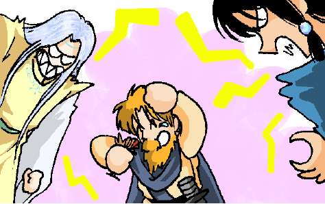ジェニアスとカイルに両側から怒鳴られて、サウルが小さくなる。