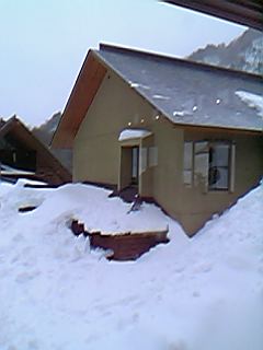 画面左の大きな建物は、本来2階建てぐらいの高さのある大浴場なのだが、1階部分が雪に埋もれてしまっている。