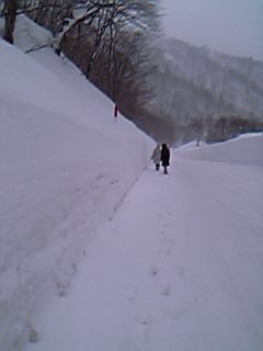 画面右の雪の壁の向こう側は、川を挟んだ渓谷で、秋には美しい景色も堪能したはずなのだが、この時期は雪の壁に阻まれて、対岸の山もほとんど見えない。
