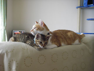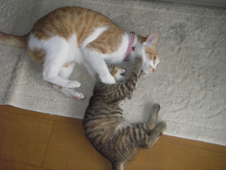 なにしろ人間の年齢に換算すれば居待はまだ幼稚園児、立待は高校生。『遊び』が全力で容赦のない居待に辟易する風情で立待が逃げたり、反撃したり教育的指導を入れたりもしているが、毛繕いもするようになった。