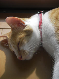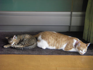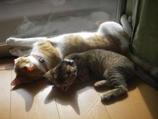2匹並んで昼寝中。外は30度手前まで気温が上がっていたはずだが、それでもこの子達は暑くはないらしく、わざわざ日向で並んで寝ているのがかなり不思議ではある。