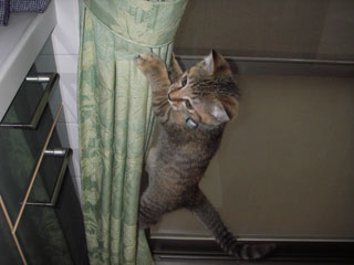 足取りもしっかりと、毎朝食べさせている猫缶を用意する私を待ちかねて、立待は足下に、居待はカーテンを…………登るなっ!!(^^;)