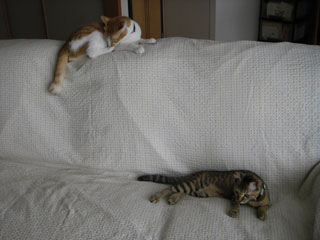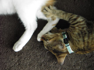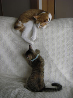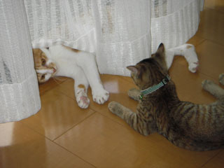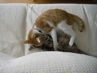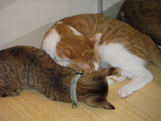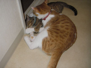 最近、時々だが、居待が立待の足の肉球を吸う。どうもおかあさんのお乳と混同している模様。単なる甘えんぼかもしれないが、この後は鬱陶しがった立待が逃げるか、もしくは蹴りで制裁されるか、どちらか(笑)。