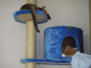 その間猫たちはというと、時折様子を見に降りて来るものの、基本的にキャットタワーへ2匹一緒に避難していた。