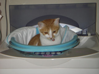 朝、歯磨きをしようと歯ブラシをくわえてふと見れば立待が洗濯籠に。