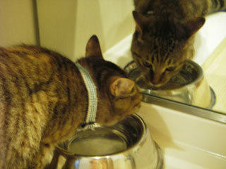何故か洗面台に水入れを置いたらそこが好みにはまったようで気に入りの水飲み場になっているのだけれど、別段鏡が嫌いなわけではないはずなのに、水を飲む時はきまってこの顔。……何故?