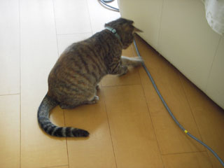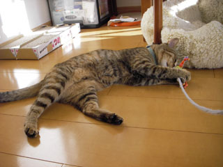 遊ぶ居待その2。Mさまに頂いたおもちゃがツボにはまったはいいがすぐソファの下に蹴り込んで「ない。」と文句を言うので(自分で蹴り込んだくせに!)ひもをつけてみた次第。