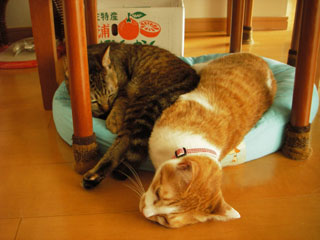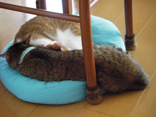 なんとなーく窮屈そうな気もするのだが、本猫たちはこれで別に問題ないらしい。