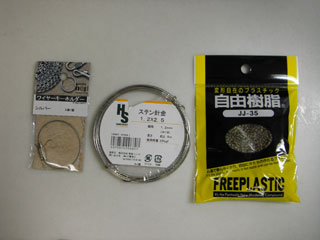 1.2mmの針金と、ワイヤータイプのキーホルダー、熱で形を自在に買えられるプラスチック樹脂。