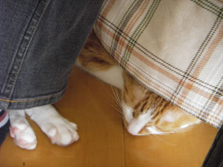 2007. 1. 1. その2。今年も例によって翠條さん、祐さんとご一緒に我が家で年越し。 猫はといえば、居待は落ち着かなかったようでキャットタワーの上にいたが、立待は膝乗り猫の本領発揮で3人の膝を渡り歩いた。 証拠写真がこれ。 体勢はもちろん寝る方向も変えるので足の踏み場に困ったけれど、それもまた良しということで。