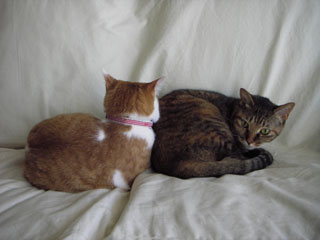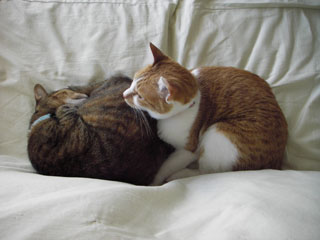 で、すこーしだけ首を傾げながら富岡八幡宮に回って、お参りしてお守りをいただいて、帰って来たら、猫達は、仲良くくっついてソファを占領していた。
