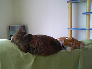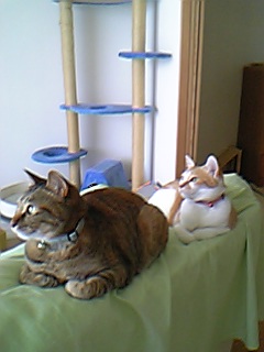 それが翌日には互いに背後からそっと忍び寄っては、振り返られ威嚇されて「しまったこっち見た!」と逃げる程度になり、さらに翌日には私を挟んでしばらく見詰めあってから、まるでそれが挨拶かのように「フー!」「シャー!」とやるぐらいになった。